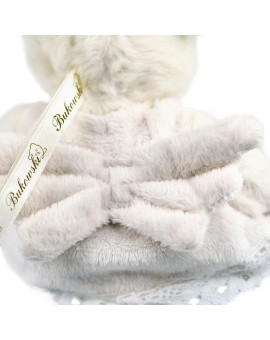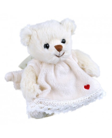 Mini oursonne blanche habillée de sa robe polaire blanche avec galon broderie, petit cœur rouge brodé et ailes d'ange au dos