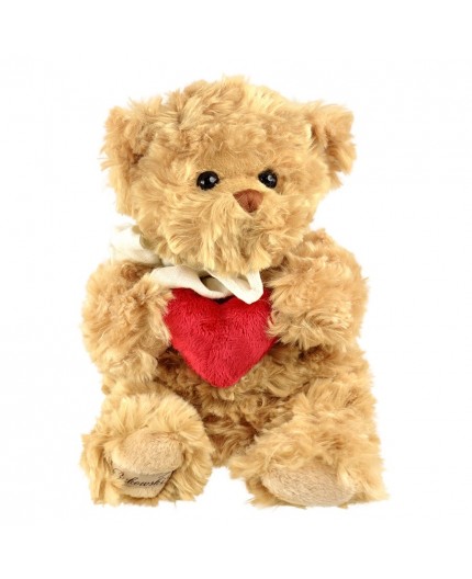 Petit ours blond habillé d'un nœud écru tenant un cœur rouge entre les mains